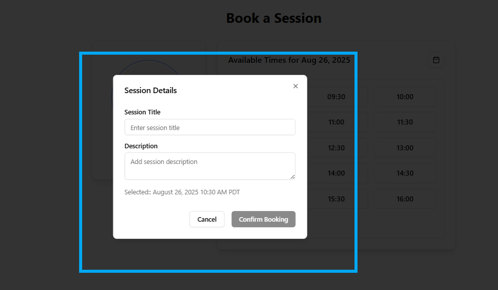 Double-check your booking information and complete your appointment by clicking the confirm option. You will be immediately confirmed, and the session will be automatically added to your calendar for easy scheduling.