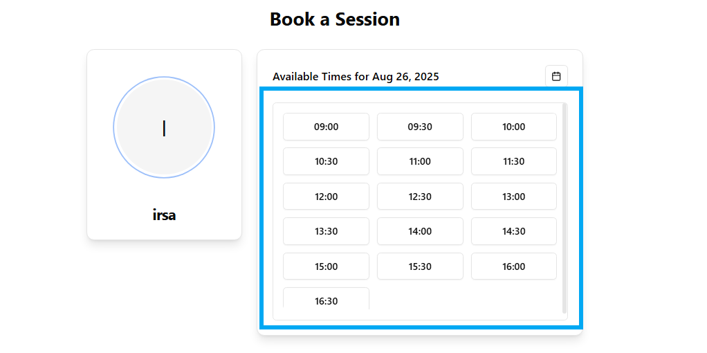 Once you have chosen your date, a list of available time slots will appear. Choose the time that is most convenient for your day to book your session easily.
