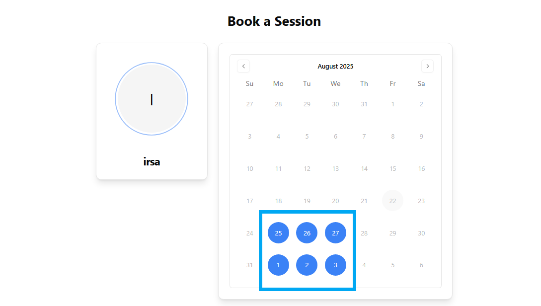 When you click "Book," a calendar will pop up with the days that are open. All you need to do is choose the date that works for you, so that your session takes place at the most convenient time.