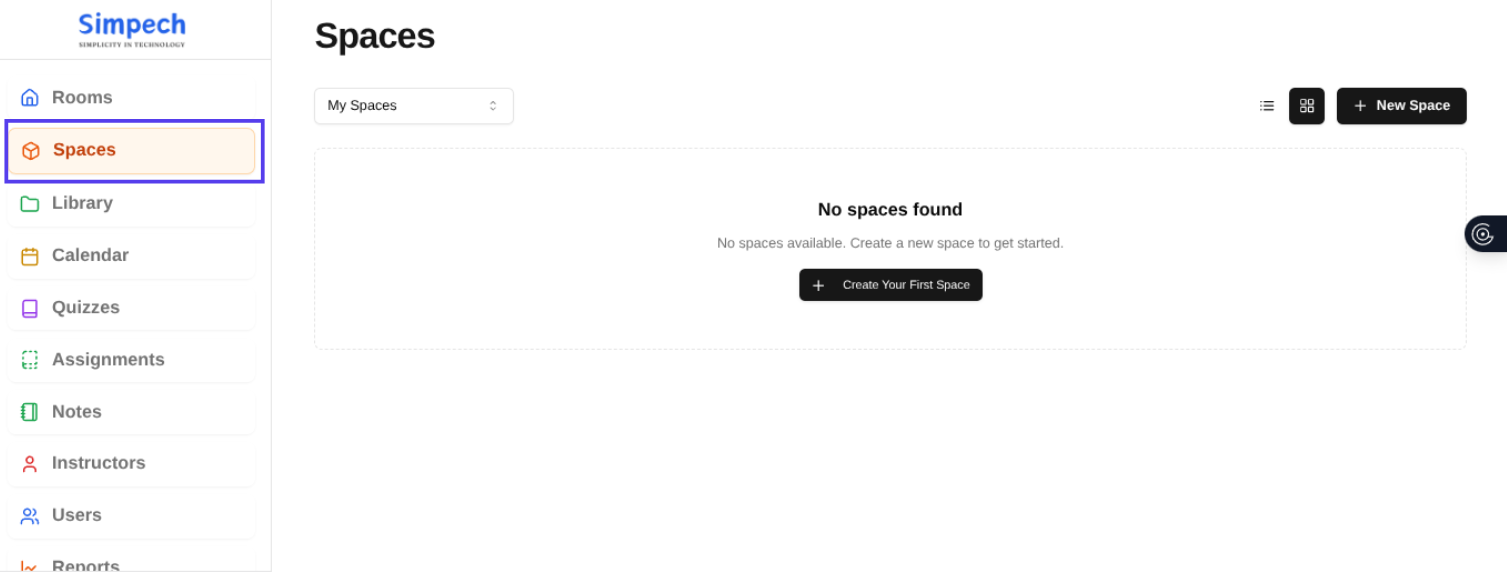 From the main Simpech Virtual Classroom interface, go to the Spaces option. This will take you to the space where you will be able to handle all your spaces.
