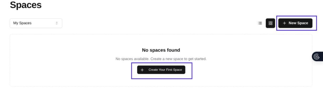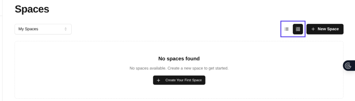 At the top of the Spaces section, there are icons for Grid view and List view.