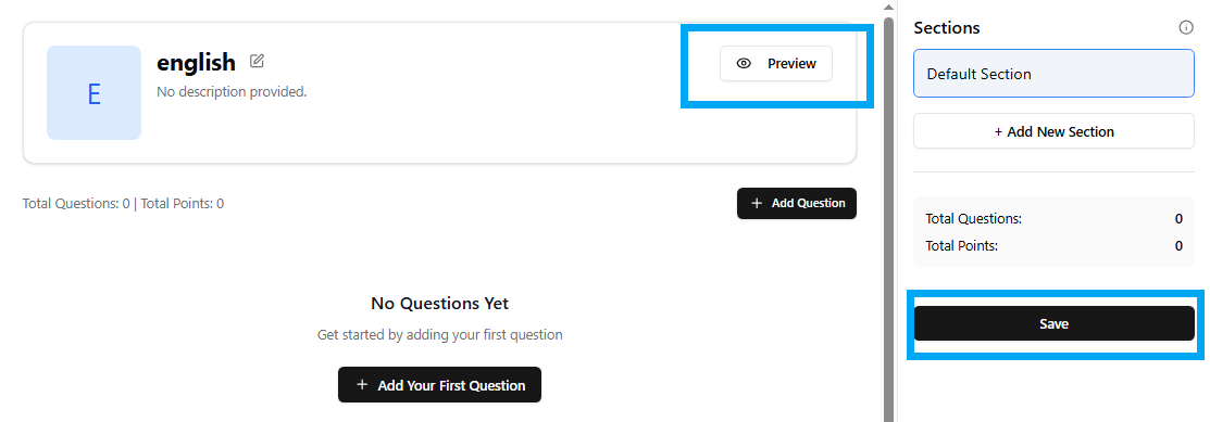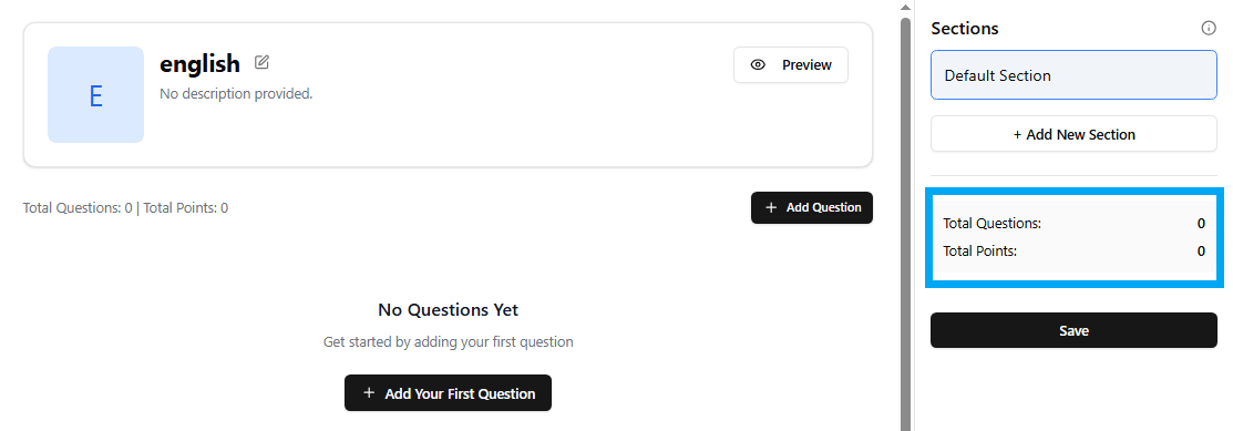 Occasionally, you might prefer to segment your quiz into various sections like multiple choice, short answers, or matching. Simpech facilitates this with the "Add New Section" feature. Each section assists in categorizing questions for improved flow and organization, making the quiz more accessible for students to try.