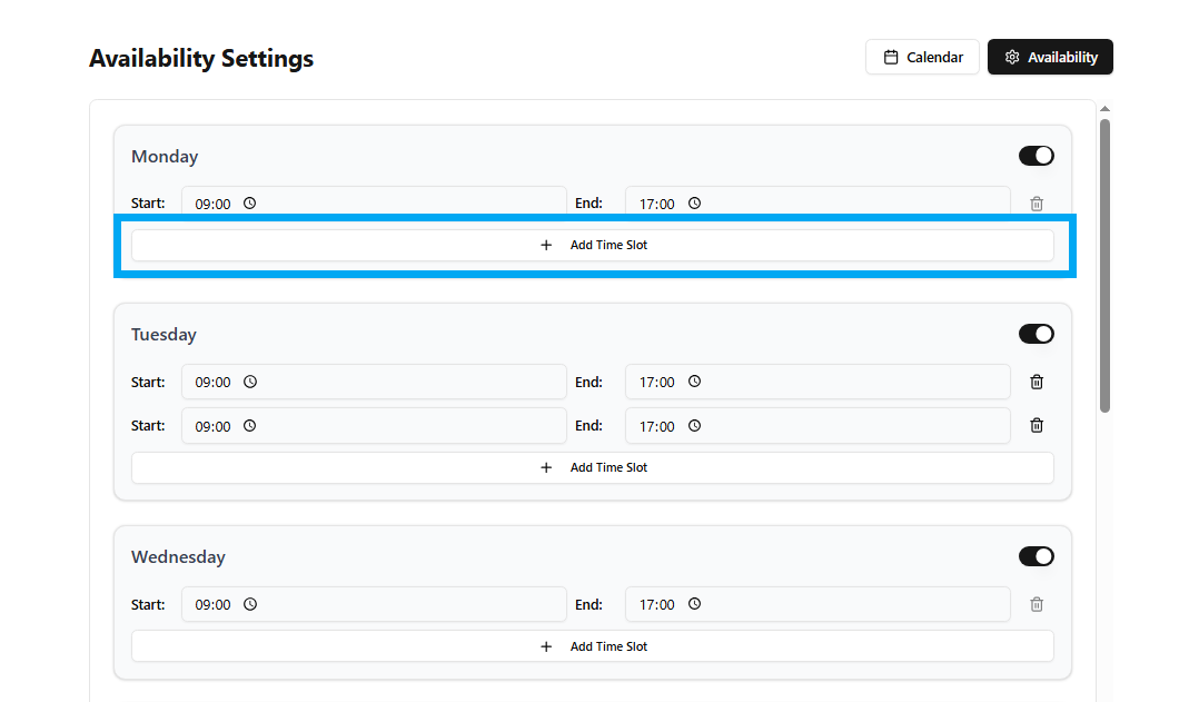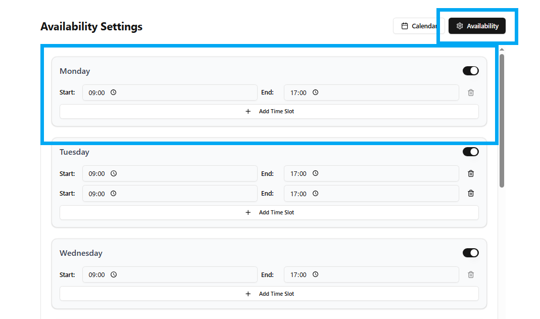 This section displays your current availability slot for the chosen day. You can define the time range here, and turn it on/off according to your needs.