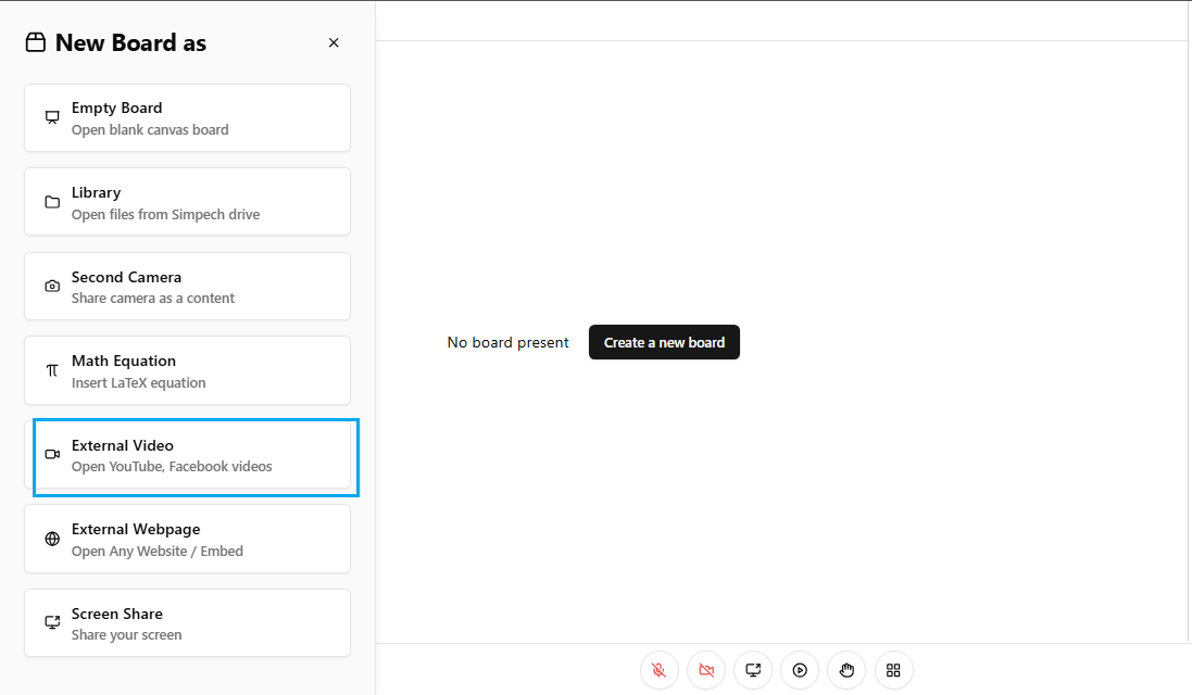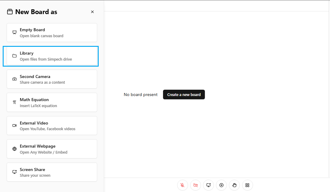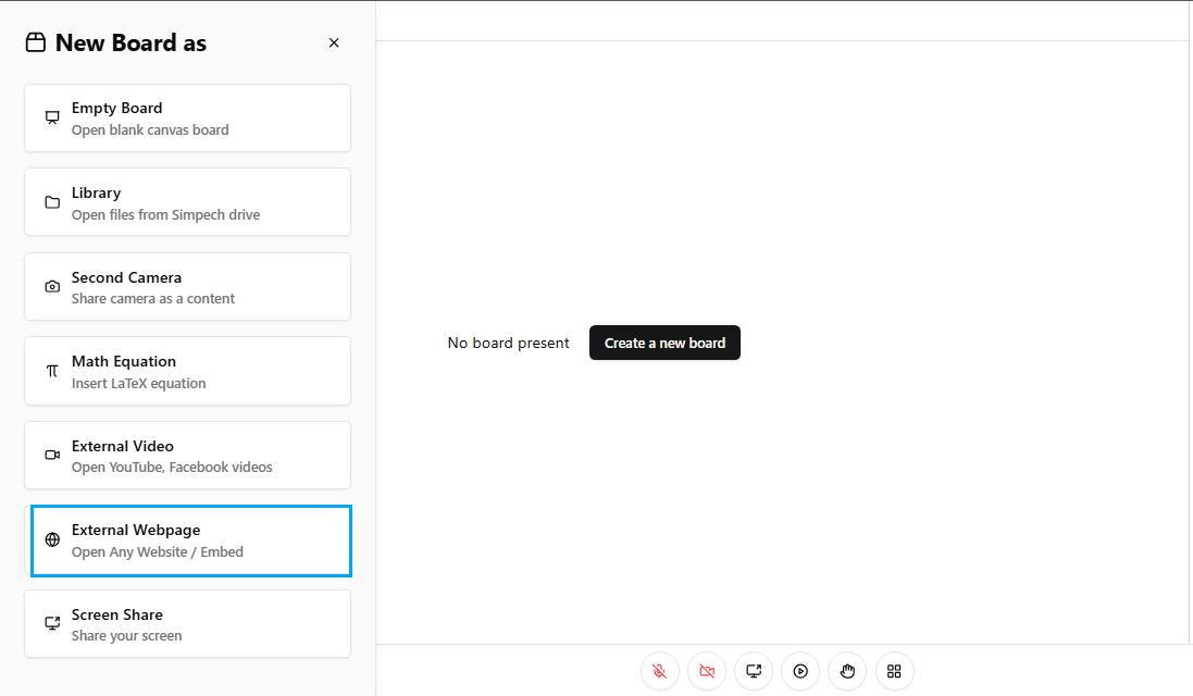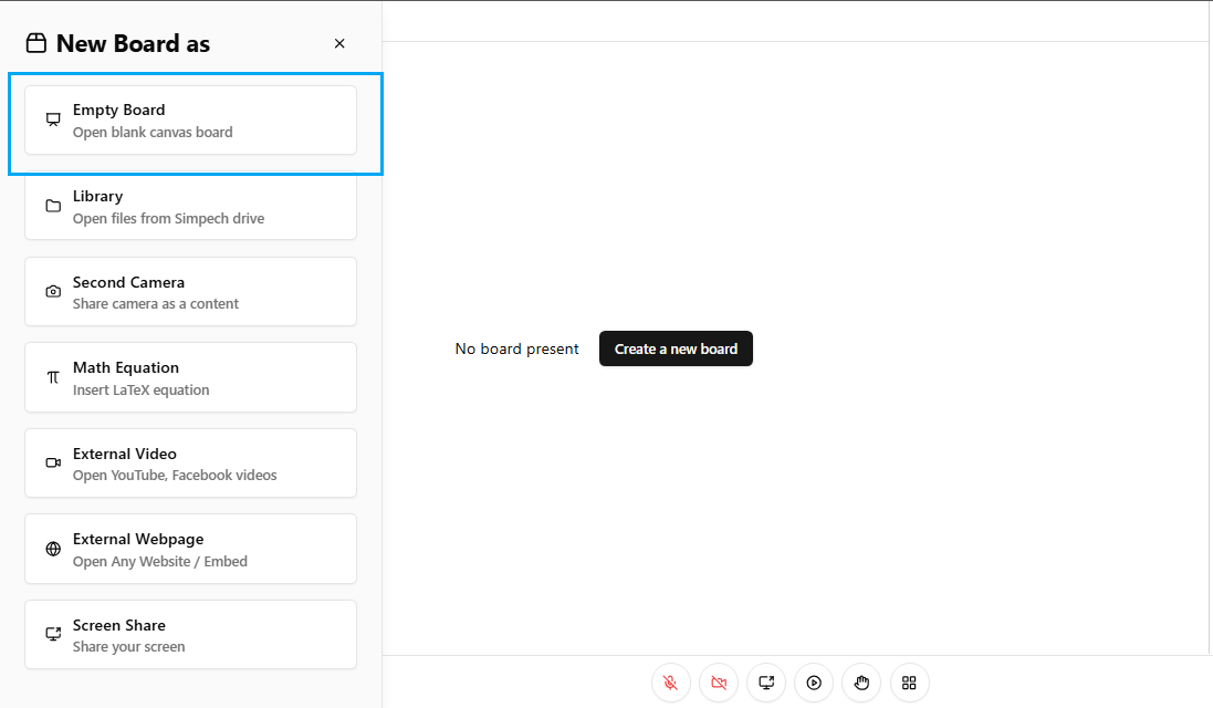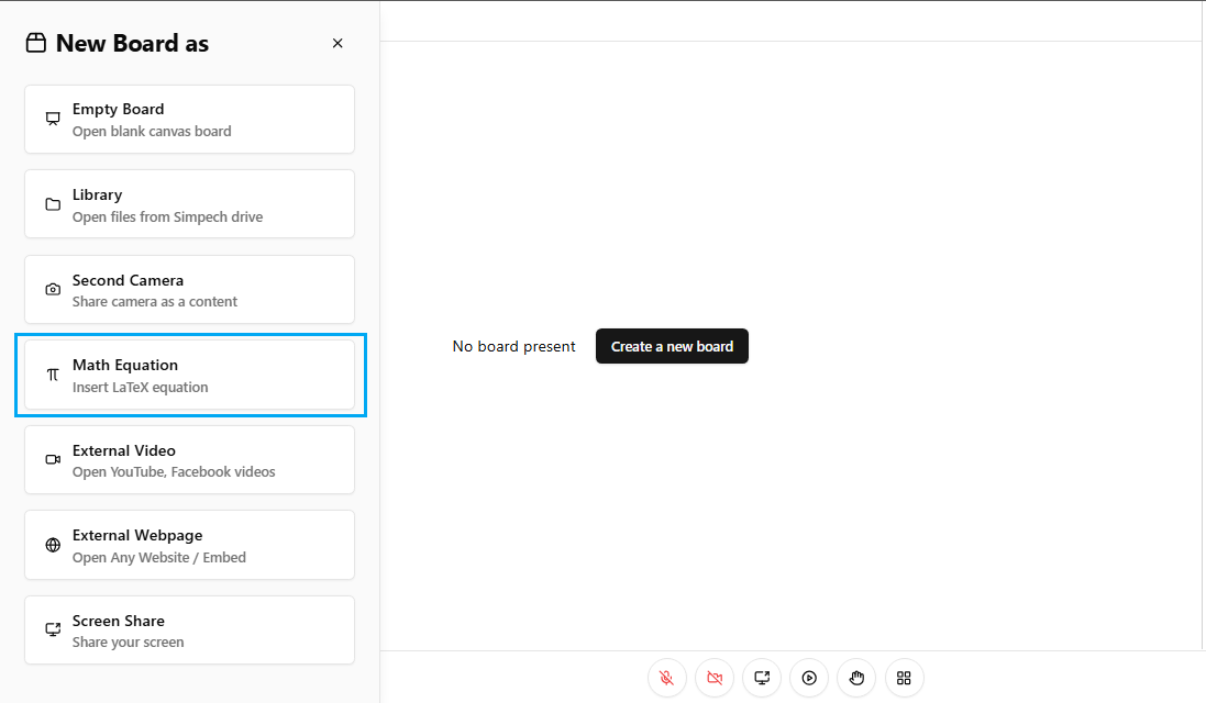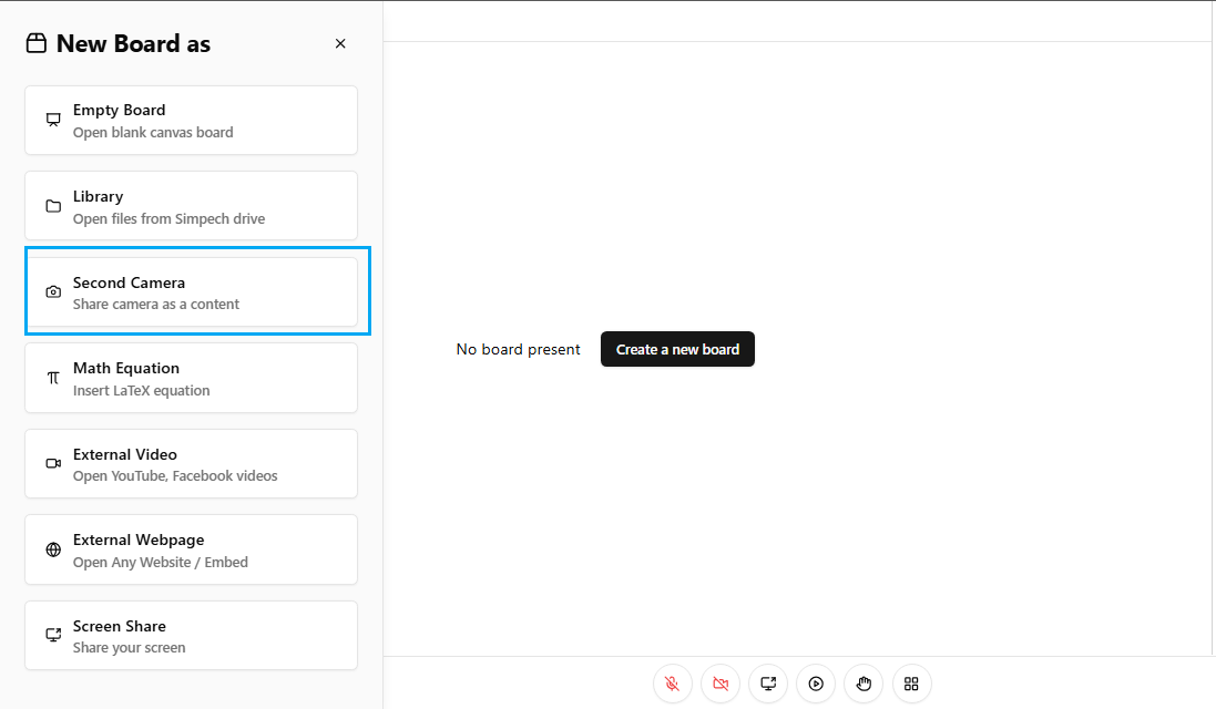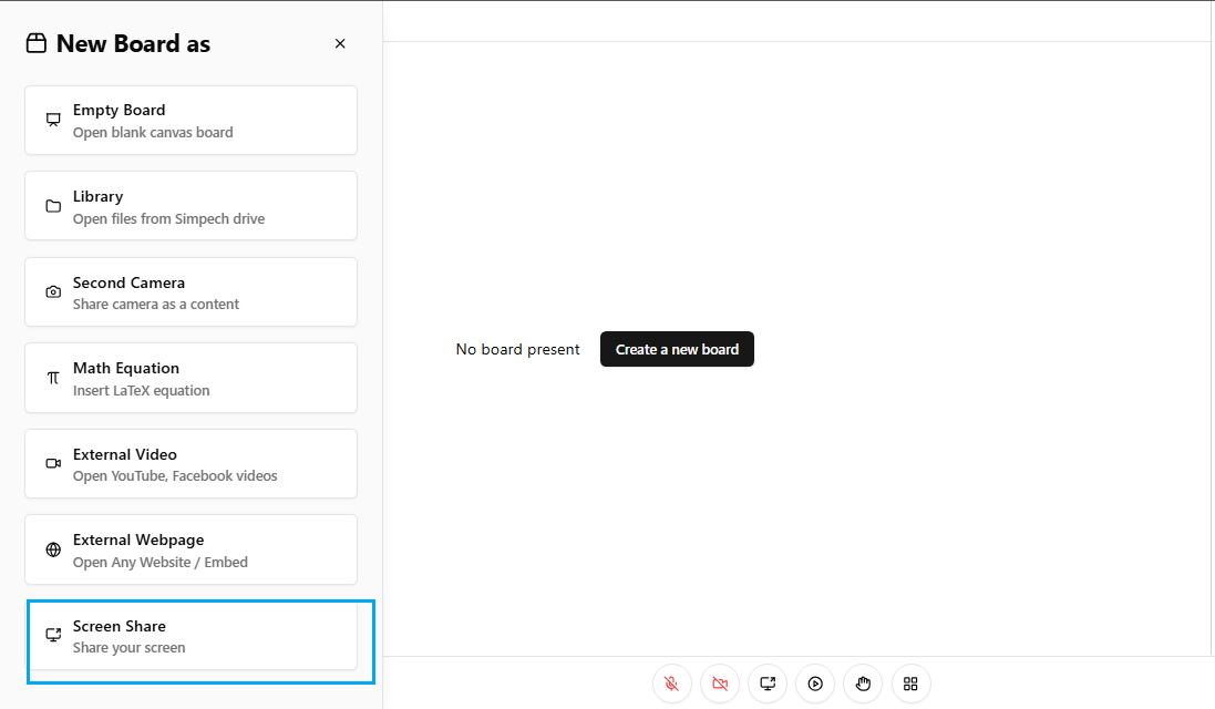When teaching online, you don't just want to speak, you want to demonstrate, explain, and engage your students. That is where SIMPECH's "Create a new board" feature enters. In one click, you can launch various types of boards and tools that can help create your class more interactive and fascinating.