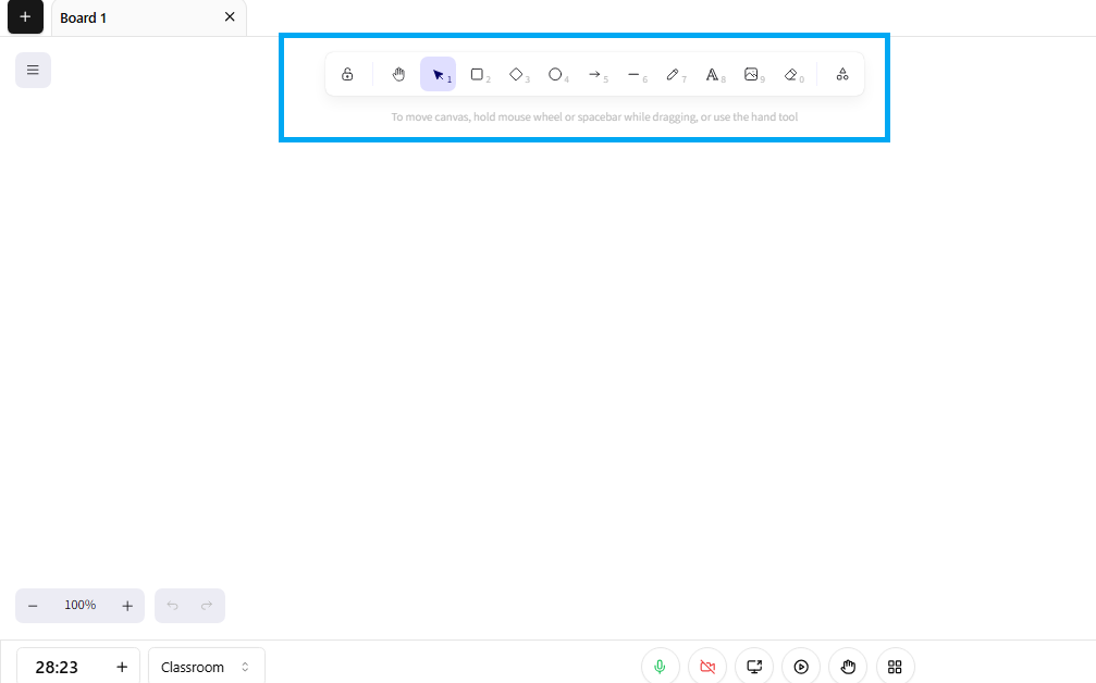 The Simpech Virtual Classroom whiteboard is a collaborative area where teachers and students can create, write, brainstorm, and work together in real-time.