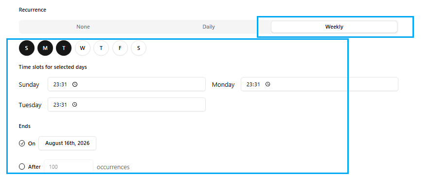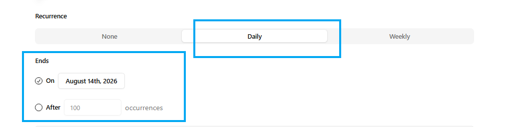 Similar to daily recurrence, you have the option to specify when it will finish, after some number of occurrences.